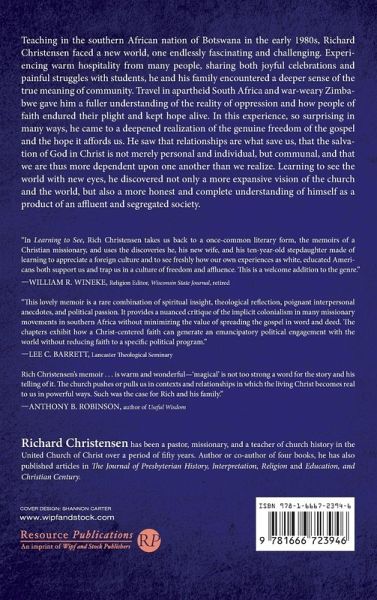 Teaching in the southern African nation of Botswana in the early 1980s, Richard Christensen faced a new world, one endlessly fascinating and challenging. Experiencing warm hospitality from many people, sharing both joyful celebrations and painful struggles with students, he and his family encountered a deeper sense of the true meaning of community. Travel in apartheid South Africa and war-weary Zimbabwe gave him a fuller understanding of the reality of oppression and how people of faith endured their plight and kept hope alive. In this experience, so surprising in many ways, he came to a deepened realization of the genuine freedom of the gospel and the hope it affords us. He saw that relationships are what save us, that the salvation of God in Christ is not merely personal and individual, but communal, and that we are thus more dependent upon one another than we realize. Learning to see the world with new eyes, he discovered not only a more expansive vision of the church and the world, but also a more honest and complete understanding of himself as a product of an affluent and segregated society.