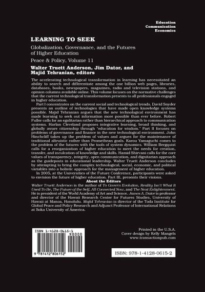The accelerating technological transformation in learn- ing has necessitated an ability to search and differentiate among the one billion web pages, libraries, databases, books, newspapers, magazines, radio and television stations, and opinion columns available online. This volume focuses on the normative challenges that the current technological transformation presents to all professionals engaged in higher education. Part I concentrates on the current social and technological trends. David Snyder presents an outline of technologies that have made open knowledge systems possible. Majid Tehranian argues that the new technological environment has made learning to seek out information more possible than ever before. Robert Fuller calls for an egalitarian rather than hierarchical approach to communication systems. Harlan Cleveland proposes integrative learning, broad thinking, and globally aware citizenship through "education for wisdom." Part II focuses on problems of governance and finance in the new technological environment. John Hinchcliff takes up the problem of values and argues for the maintenance of traditional altruistic rather than Promethean goals. Karou Yamaguchi comes to the problem of the futures with the tools of system dynamics. William Bergquist calls for a reorganization of higher education to meet the needs for creation, transfer, and inculcation of knowledge and skills. Hamid Shirvani calls for the core values of transparency, integrity, open communication, and dignitarian approach as the guideposts in educational leadership. Walter Truett Anderson concludes by attempting to bring the complex technological, social, economic, and political variables into a holistic approach for the management of higher education. In 2005, at the Universities of the Future Conference, participants were asked to envision the future of higher education. Part III, presents their visions.