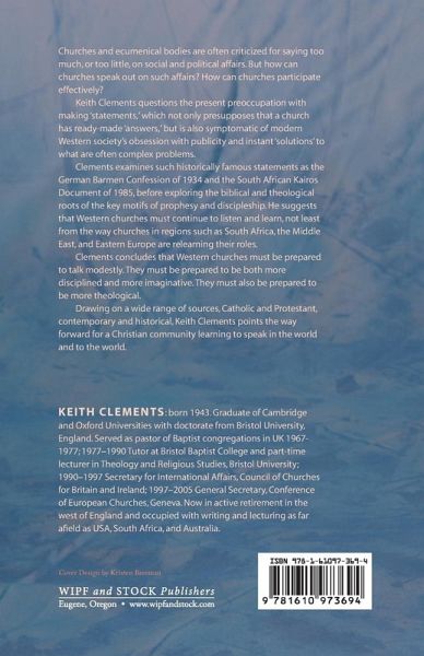 Churches and ecumenical bodies are often criticized for saying too much, or too little, on social and political affairs. But how can churches speak out on such affairs? How can churches participate effectively? Keith Clements questions the present preoccupation with making 'statements', which not only presupposes that a church has ready-made 'answers', but is also symptomatic of modern Western society's obsession with publicity and instant 'solutions' to what are often complex problems. Clements examines such historically famous statements as the German Barmen Declaration of 1934 and the South African Kairos Document of 1985, before exploring the biblical and theological roots of the key motifs of prophesy and discipleship. He suggests that Western churches must continue to listen and learn, not least from the way churches in regions such as South Africa, the Middle East, and Eastern Europe are relearning their roles. Clements concludes that Western churches must be prepared to talk modestly. They must be prepared to be both more disciplined and more imaginative. They must also be prepared to be more theological. Drawing on a wide range of sources, Catholic and Protestant, contemporary and historical, Clements points the way forward for a Christian community learning to speak in the world and to the world.