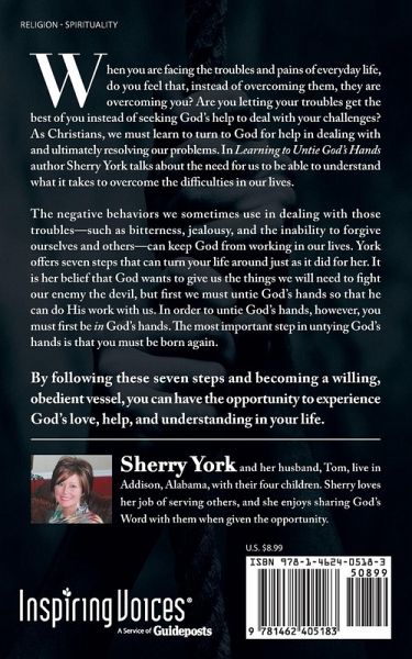 When you are facing the troubles and pains of everyday life, do you feel that, instead of overcoming them, they are overcoming you? Are you letting your troubles get the best of you instead of seeking God's help to deal with your challenges? As Christians, we must learn to turn to God for help in dealing with and ultimately resolving our problems. In Learning to Untie God's Hands author Sherry York talks about the need for us to be able to understand what it takes to overcome the difficulties in our lives. The negative behaviors we sometimes use in dealing with those troubles-such as bitterness, jealousy, and the inability to forgive ourselves and others-can keep God from working in our lives. York offers seven steps that can turn your life around just as it did for her. It is her belief that God wants to give us the things we will need to fight our enemy the devil, but first we must untie God's hands so that he can do His work with us. In order to untie God's hands, however, you must first be in God's hands. The most important step in untying God's hands is that you must be born again. By following these seven steps and becoming a willing, obedient vessel, you can have the opportunity to experience God's love, help, and understanding in your life.