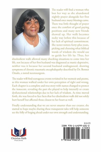 The reader will find a woman who lost her way as she abandoned nightly prayer alongside her first husband once many blessings came. There was little thought of prayer once the comfort of good paying positions and many new friends showed up. Her walk becomes rocky way before this because of her lack of spiritual commitment. She teeter-totters forty-plus years, picking and choosing what biblical words of wisdom she would use to guide her life by. Thus, her disobedient walk allowed many shocking situations to come into her life, not because of her first husband was diagnosed as manic-depressive, neither was it because her second husband undiagnosed, showing symptoms of chronic traumatic encephalopathy described by Dr. Bennet Omalu, a noted neurosurgeon. The reader will find outrageous events revisited in her memoir and poems, as this woman walked under her own perception of right and wrong. Each chapter is a complete and true story with names changed to protect the innocent, revealing the part she played to help intensify or create dysfunctional relationships due to her lack of wisdom. As time moved forth, she was forced to face facts that her disobedient walk did not solely hurt herself but affected those closest to her heart as well. Finally understanding that we are never smarter than our creator, she started to hope maybe sharing these transparent tales will help someone see the folly of forging ahead under our own strength and understanding.