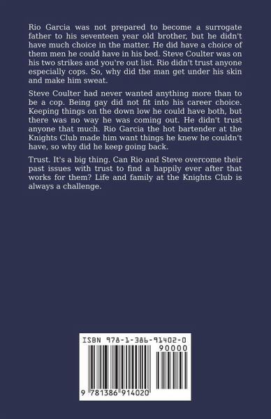 Rio Garcia was not prepared to become a surrogate father to his seventeen year old brother, but he didn't have much choice in the matter. He did have a choice of them men he could have in his bed. Steve Coulter was on his two strikes and you're out list. Rio didn't trust anyone especially cops. So, why did the man get under his skin and make him sweat. Steve Coulter had never wanted anything more than to be a cop. Being gay did not fit into his career choice. Keeping things on the down low he could have both, but there was no way he was coming out. He didn't trust anyone that much. Rio Garcia the hot bartender at the Knights Club made him want things he knew he couldn't have, so why did he keep going back. Trust. It's a big thing. Can Rio and Steve overcome their past issues with trust to find a happily ever after that works for them? Life and family at the Knights Club is always a challenge.