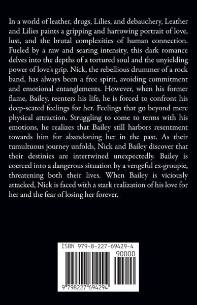 In a world of leather, drugs, Lilies, and debauchery, Leather and Lilies paints a gripping and harrowing portrait of love, lust, and the brutal complexities of human connection. Fueled by a raw and searing intensity, this dark romance delves into the depths of a tortured soul and the unyielding power of love's grip. Nick, the rebellious drummer of a rock band, has always been a free spirit, avoiding commitment and emotional entanglements. However, when his former flame, Bailey, reenters his life, he is forced to confront his deep-seated feelings for her. Feelings that go beyond mere physical attraction. Struggling to come to terms with his emotions, he realizes that Bailey still harbors resentment towards him for abandoning her in the past. As their tumultuous journey unfolds, Nick and Bailey discover that their destinies are intertwined unexpectedly. Bailey is coerced into a dangerous situation by a vengeful ex-groupie, threatening both their lives. When Bailey is viciously attacked, Nick is faced with a stark realization of his love for her and the fear of losing her forever.