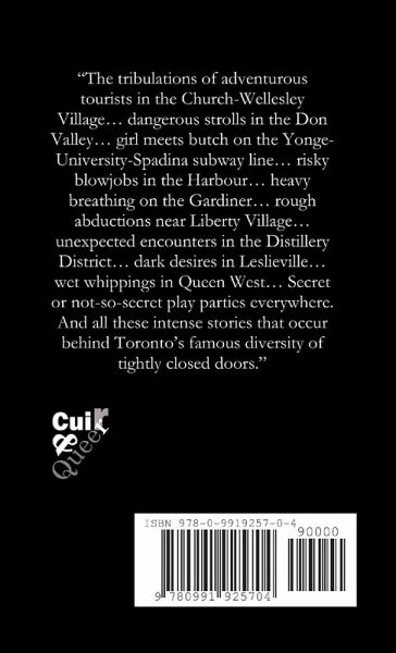 "The tribulations of adventurous tourists in the Church-Wellesley Village... dangerous strolls in the Don Valley... girl meets butch on the Yonge-University-Spadina subway line... risky blowjobs in the Harbour... heavy breathing on the Gardiner... rough abductions near Liberty Village... unexpected encounters in the Distillery District... dark desires in Leslieville... wet whippings in Queen West... Secret or not-so-secret play parties everywhere. And all these intense stories that occur behind Toronto's famous diversity of tightly closed doors." A bdsm anthology edited by Youkali Youkali and published by Cuir & Queer.