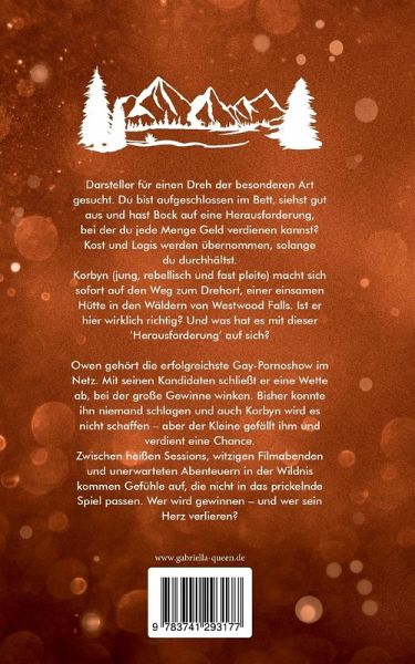Darsteller für einen Dreh der besonderen Art gesucht. Du bist aufgeschlossen im Bett, siehst gut aus und hast Bock auf eine Herausforderung, bei der du jede Menge Geld verdienen kannst? Kost und Logis werden übernommen, solange du durchhältst.Korbyn (jung, rebellisch und fast pleite) macht sich sofort auf den Weg zum Drehort, einer einsamen Hütte in den Wäldern von Westwood Falls. Ist er hier wirklich richtig? Und was hat es mit dieser Herausforderung auf sich?Owen gehört die erfolgreichste Gay-Pornoshow im Netz. Mit seinen Kandidaten schließt er eine Wette ab, bei der große Gewinne winken. Bisher konnte ihn niemand schlagen und auch Korbyn wird es nicht schaffen - aber der Kleine gefällt ihm und verdient eine Chance.Zwischen heißen Sessions, witzigen Filmabenden und unerwarteten Abenteuern in der Wildnis kommen Gefühle auf, die nicht in das prickelnde Spiel passen. Wer wird gewinnen - und wer sein Herz verlieren?