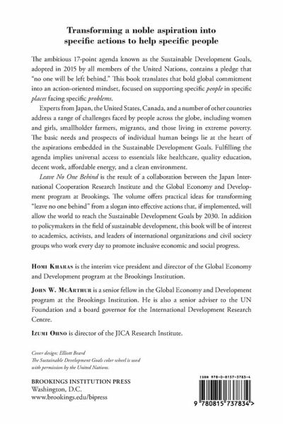 The ambitious 15-year agenda known as the Sustainable Development Goals, adopted in 2015 by all members of the United Nations, contains a pledge that "no one will be left behind." This book aims to translate that bold global commitment into an action-oriented mindset, focused on supporting specific people in specific places who are facing specific problems. In this volume, experts from Japan, the United States, Canada, and other countries address a range of challenges faced by people across the globe, including women and girls, smallholder farmers, migrants, and those living in extreme poverty. These are many of the people whose lives are at the heart of the aspirations embedded in the 17 Sustainable Development Goals. They are the people most in need of such essentials as health care, quality education, decent work, affordable energy, and a clean environment. This book is the result of a collaboration between the Japan International Cooperation Research Institute and the Global Economy and Development program at Brookings. It offers practical ideas for transforming "leave no one behind" from a slogan into effective actions which, if implemented, will make it possible to reach the Sustainable Development Goals by 2030. In addition to policymakers in the field of sustainable development, this book will be of interest to academics, activists, and leaders of international organizations and civil society groups who work every day to promote inclusive economic and social progress.