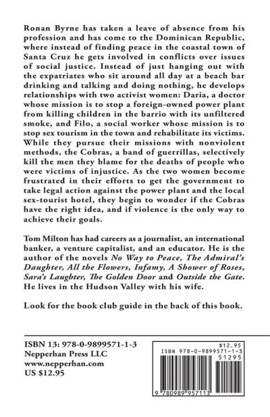 Ronan Byrne has taken a leave of absence from his profession and has come to the Dominican Republic, where instead of finding peace in the coastal town of Santa Cruz he gets involved in conflicts over issues of social justice. Instead of just hanging out with the expatriates who sit around all day at a beach bar drinking and talking and doing nothing, he develops relationships with two activist women: Daria, a doctor whose mission is to stop a foreign-owned power plant from killing children in the barrio with its unfiltered smoke, and Filo, a social worker whose mission is to stop sex tourism in the town and rehabilitate its victims. While they pursue their missions with nonviolent methods, the Cobras, a band of guerrillas, selectively kill the men they blame for the deaths of people who were victims of injustice. As the two women become frustrated in their efforts to get the government to take legal action against the power plant and the local sex-tourist hotel, they begin to wonder if the Cobras have the right idea, and if violence is the only way to achieve their goals.