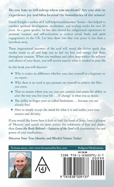 Do you hate to fall asleep when you meditate? Are you able to experience the joy and bliss of Creation beyond the boundaries of the senses? David Knight¿author of 8 'self-help/transformation' books¿has helped to conduct spiritual development and healing circles for over 25 years. As a guest speaker, he has also shared his enlightened experiences to promote 'oneness' and self-realization at various mind, body, and spirit engagements in the UK. Let him show you the true peace that rests inside you. These inspirational journeys of the soul will reveal the divine spark that resides within us all and help you to feel the love and energy that flows throughout creation. Know that within the stillness of your heart, you receive exactly what is needed in your life. In this book you will discover: ¿ Why it makes no difference whether you class yourself as a beginner or an expert. ¿ Why there is no need to put pressure on yourself to achieve the peace you crave. ¿ That no matter where you are, you can connect and retain the ability to alter the way you live your life ... if 'change' is what you so desire. ¿ The need to forget your so-called limitations ... because you are already free! ¿ How to accept the mind for what it is and realize your true essence and divinity. If you would like to know how it feels to hold the hand of Jesus, have a glimpse of 'Heaven', and search no more within the wilderness of fear and doubt, then Leave the Body Behind-Sojourns of the Soul will demonstrate the real power of your meditations. Discover Your True Identity and Blissful Nature Today!