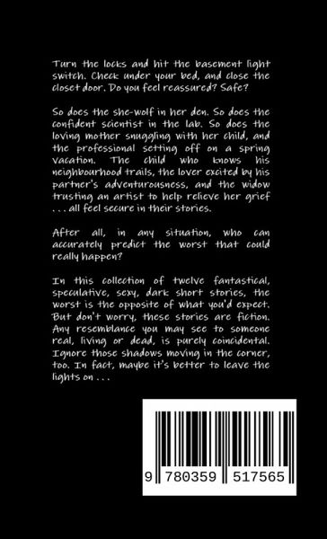 Turn the locks and hit the basement light switch. Check under your bed, and close the closet door. Do you feel reassured? Safe? So does the she-wolf in her den. So does the confident scientist in the lab. So does the loving mother snuggling with her child, and the professional setting off on a spring vacation. The child who knows his neighbourhood trails, the lover excited by his partner's adventurousness, and the widow trusting an artist to help relieve her grief . . . all feel secure in their stories. After all, in any situation, who can accurately predict the worst that could really happen? In this collection of twelve fantastical, speculative, sexy, dark short stories, the worst is the opposite of what you'd expect. But don't worry, these stories are fiction. Any resemblance you may see to someone real, living or dead, is purely coincidental. Ignore those shadows moving in the corner, too. In fact, maybe it's better to leave the lights on . . .