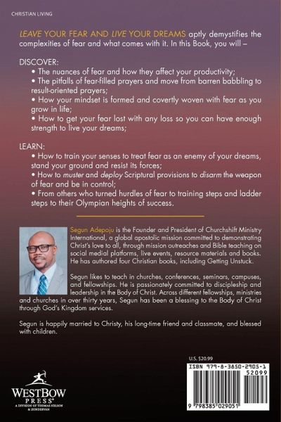 LEAVE YOUR FEAR AND LIVE YOUR DREAMS aptly demystifies the complexities of fear and what comes with it. In this Book, you will - DISCOVER: - The nuances of fear and how they affect your productivity; - The pitfalls of fear-filled prayers and move from barren babbling to result-oriented prayers; - How your mindset is formed and covertly woven with fear as you grow in life; - How to get your fear lost with any loss so you can have enough strength to live your dreams; LEARN: - How to train your senses to treat fear as an enemy of your dreams, stand your ground and resist its forces; - How to muster and deploy Scriptural provisions to disarm the weapon of fear and be in control; - From others who turned hurdles of fear to training steps and ladder steps to their Olympian heights of success.