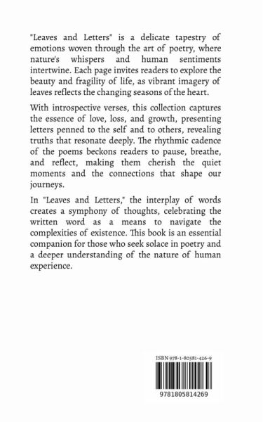 "Leaves and Letters" is a delicate tapestry of emotions woven through the art of poetry, where nature's whispers and human sentiments intertwine. Each page invites readers to explore the beauty and fragility of life, as vibrant imagery of leaves reflects the changing seasons of the heart. With introspective verses, this collection captures the essence of love, loss, and growth, presenting letters penned to the self and to others, revealing truths that resonate deeply. The rhythmic cadence of the poems beckons readers to pause, breathe, and reflect, making them cherish the quiet moments and the connections that shape our journeys. In "Leaves and Letters," the interplay of words creates a symphony of thoughts, celebrating the written word as a means to navigate the complexities of existence. This book is an essential companion for those who seek solace in poetry and a deeper understanding of the nature of human experience.