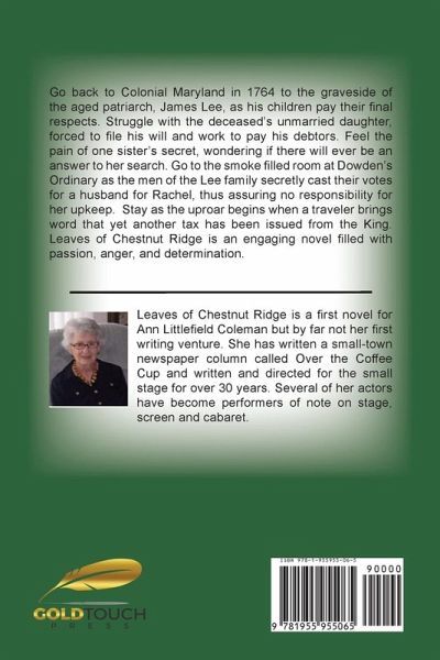 Go back to Colonial Maryland in 1764 to the graveside of the aged patriarch, James Lee, as his children pay their final respects. Struggle with the deceased's unmarried daughter, forced to file his will and work to pay his debtors. Feel the pain of one sister's secret, wondering if there will ever be an answer to her search. Go to the smoke filled room at Dowden's Ordinary as the men of the Lee family secretly cast their votes for a husband for Rachel, thus assuring no responsibility for her upkeep. Stay as the uproar begins when a traveler brings word that yet another tax has been issued from the King. Leaves of Chestnut Ridge is an engaging novel filled with passion, anger, and determination.