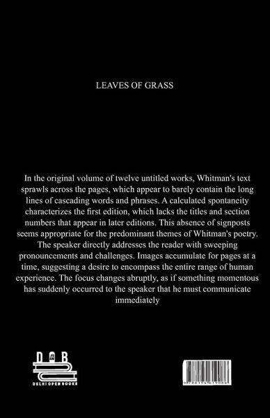 In 1855 Walt Whitman published his first collection of poetry, Leaves of Gras. The poems of Leaves of Grass are loosely connected, with each representing Whitman's celebration of his philosophy of life and humanity. This book is notable for its discussion of delight in sensual pleasures during a time when such candid displays were considered immoral. Influenced by Ralph Waldo Emerson and the Transcendentalist movement, itself an offshoot of Romanticism, Whitman's poetry praises nature and the individual human's role in it.Leaves of Grass was highly controversial during its time for its explicit sexual imagery, and Whitman was subject to derision by many contemporary critics. Over time, however, the collection has infiltrated popular culture and been recognized as one of the central works of American poetry.