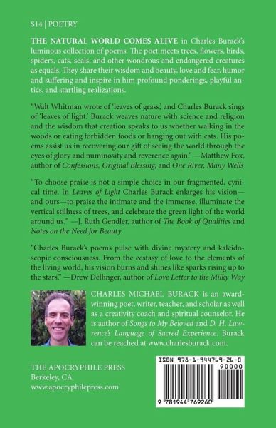 The natural world comes alive in Charles Burack's luminous collection of poems. The poet meets trees, flowers, birds, spiders, cats, seals, and other wondrous and endangered creatures as equals. They share their wisdom and beauty, love and fear, humor and suffering and inspire in him profound ponderings, playful antics, and startling realizations. Other poems scintillate with the mysteries of human love, loss, death, and celebration. The poem entitled "I Am" won first prize in the international Songs of the Soul Poetry Contest. "Walt Whitman wrote of 'leaves of grass,' and Charles Burack sings of 'leaves of light.' Burack weaves nature with science and religion and the wisdom that creation speaks to us whether walking in the woods or eating forbidden foods or hanging out with cats. His poems assist us in recovering our gift of seeing the world through the eyes of glory and numinosity and reverence again." —Matthew Fox, author of Original Blessing, Confessions, and One River, Many Wells "To choose praise is not a simple choice in our fragmented, cynical time. In Leaves of Light Charles Burack enlarges his vision—and ours—to praise the intimate and the immense, illuminate the vertical stillness of trees, and celebrate the green light of the world around us." —J. Ruth Gendler, author of The Book of Qualities and Notes on the Need for Beauty "Charles Burack’s poems pulse with divine mystery and kaleidoscopic consciousness. His passionate verses spring from a soul in communion with a mystic, sacred cosmos. From the ecstasy of love to the elements of the living world, Burack’s vision burns and shines like sparks rising up to the stars." —Drew Dellinger, author of Love Letter to the Milky Way CHARLES MICHAEL BURACK is an award-winning poet, writer, teacher, and scholar as well as a creativity coach and spiritual counselor. He is author of Songs to My Beloved and D. H. Lawrence’s Language of Sacred Experience. You can learn more about the author and preview Leaves of Light at www.charlesburack.com.