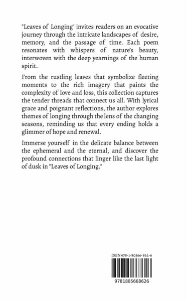 "Leaves of Longing" invites readers on an evocative journey through the intricate landscapes of desire, memory, and the passage of time. Each poem resonates with whispers of nature's beauty, interwoven with the deep yearnings of the human spirit. From the rustling leaves that symbolize fleeting moments to the rich imagery that paints the complexity of love and loss, this collection captures the tender threads that connect us all. With lyrical grace and poignant reflections, the author explores themes of longing through the lens of the changing seasons, reminding us that every ending holds a glimmer of hope and renewal. Immerse yourself in the delicate balance between the ephemeral and the eternal, and discover the profound connections that linger like the last light of dusk in "Leaves of Longing."