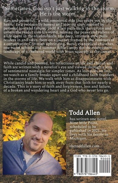 "Sometimes, God isn't just walking in the storm, He is the storm." Raw and powerful, "a wild, emotional ride that grabs you by the heart." In a profoundly honest and moving story marked by personal loss and failure, Todd Allen pulls back the curtain and ushers the reader into his world, reliving the peaks and valleys of a life spent in the shadowlands. His deep, intimate style pull readers in and takes them on a journey framed by the contours of a conservative Christian upbringing. Rural, evangelical churches, one-room schools and summer Bible camps dot the midwestern landscape of a sheltered world with Jesus squarely at the center. While candid and pointed, his reflections on life and church and faith are written with a novelist's eye and viewed through a lens of sentimental nostalgia for simpler times. As loss piles on loss, we watch as a family breaks apart and a childhood faith founders in the storms of life. We walk with him as disappointment with Christianity leads him to walk away from that faith for nearly a decade. This is a story of faith and forgiveness, loss and failure, of a broken and wandering heart and a God who never lets go.