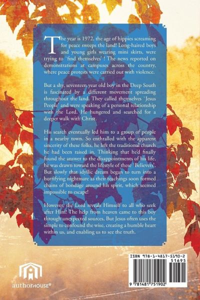 The year is 1972, the age of hippies screaming for peace sweeps the land! Long-haired boys and young girls wearing mini skirts, were trying to `find themselves' ! The news reported on demonstrations at campuses across the country, where peace protests were carried out with violence. But a shy, seventeen year old boy in the Deep South is fascinated by a different movement spreading throughout the land. They called themselves `Jesus People' and were speaking of a personal relationship with the Lord. He hungered and searched for a deeper walk with Christ. His search eventually led him to a group of people in a nearby town. So enthralled with the apparent sincerity of these folks, he left the traditional church he had been raised in. Thinking that he'd finally found the answer to the disappointments of his life, he was drawn toward the lifestyle of these `Believers'. But slowly that idyllic dream began to turn into a horrifying nightmare as their teachings soon formed chains of bondage around his spirit, which seemed impossible to escape! However, the Lord reveals Himself to all who seek after Him! The help from heaven came to this boy through unexpected sources, But Jesus often uses the simple to confound the wise, creating a humble heart within us, and enabling us to see the truth.