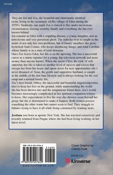 They are Jen and Zoe, the beautiful and charismatic identical twins, living in the seemingly idyllic village of Eden during the 1970's. Suddenly, one night Zoe is forced to flee under mysterious circumstances, leaving security, family and everything she has ever known behind. Jen remains in Eden with a crippling disease, a young daughter, and an unwelcome and very persistent ghost. The unlucky twin is caught in the midst of not only her own problems, but of family members like poor, hysterical Aunt Connie, who keeps misplacing things, and Aunt Caroline whose family is in a state of total disrepair. Once Zoe leaves Eden, her life is on the upswing. She has a successful career as a music reporter for a young, hip television network and more money than anyone knows. When she meets Clive, the rock 'n' roll superstar, her life is taken to another level of success and excess that sweeps her from her home and opens doors for new opportunities she's never dreamed of. Sean, the gentle and supportive husband, is caught in the middle of the fast lane lifestyle and is always looking for the exit ramp and a normal family life. Zoe's best friend, Abbey, the successful and beautiful singer/songwriter, tries to keep her feet on the ground, while understanding the world she has been thrown into and the temptations found there. Jen's world becomes increasingly complicated as her spiritual companion refuses to leave. Her expectations to live the way she chooses seem beyond her grasp, but she is determined to make it happen. Both women possess something the other wants but cannot seem to find. They struggle to balance trying to have it all while being consumed by wanting more.