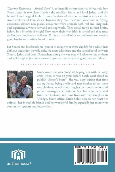"Leaving Essenwood ~ Simon's Story" is an incredible story about a 14 year old boy Simon, and his two close friends - the steadfast, funny and loyal Jethro, and the beautiful and magical Leah. It takes the three of them on a mission to rescue the stolen children of Fern Valley. Together they meet new and sometimes terrifying characters, explore new places, encounter weird animals both real and imagined, and experience a whole new and exciting world. They are all tested to their limits, helped by a little bit of magic! They know their friendship is special and they trust each other completely - well sort of! It is a story full of twists and turns, some really good laughs and a whole lot of trouble. Let Simon and his friends pull you in to escape your every day life for a while! Just chill out and enjoy the wild ride, the crazy adventure and the special bond between Simon, Jethro and Leah. Somewhere along the way you will relate to one of them and will imagine, just for a moment, you are on the amazing journey with them.