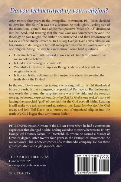 Feeling betrayed by your religion? After 24 years in the Evangelical movement, Phil Davis decided to leave his "first faith." It was not a decision he took lightly. Feeling sick of the institutional church, tired of the manipulative "voice of God" drummed into his head, and trusting that the real God was somewhere beyond the theology he was taught, the author deconstructed and then reconstructed his view of the Divine Presence. In Leaving God for God, Davis takes us on his journey to de-program himself and open himself to the God beyond any one religion. Along the way, he asked himself some hard questions: · How much of our faith is based upon a set of church "doctrines" that we are told to believe? · Is God just a theological construct? · Wouldn't a truly divine Superior Being be above and beyond our religious beliefs? · Is it possible that religion can be a major obstacle to discovering the truth about the Divine? In the end, Davis wound taking a wrecking ball to his old theological house of cards. Is that a dangerous proposition? Perhaps so. But the journey was worth the drama, the surprises were worth the risk, and the rewards were quite beyond expectations. Leaving God for God is one seeker's story of leaving the parochial "god" of one faith for the God over all faiths. Reading it will make you ask some hard questions, too. Buy Leaving God for God today, and join Phil Davis on a journey out of organized religion into the truth of a God bigger than any human faith.