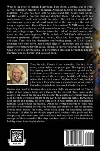 What is the price of justice? Everything. Bass Olson, a genius, out-of-work software designer, returns to Innocence, Arkansas, to be by his grandfather's deathbed. No one has been able to understand Old Zeke's final words, but Bass creates a program that can decipher them. Old Zeke wants his son's murderer caught and brought to justice. The fact that Daniel's death seventeen years prior was deemed accidental at the time is just the first of many complications. Gran Olson is a feisty retired MASH nurse whose ingenuity and devotion are well-known in Innocence. The night her husband dies, everything changes. Once she learns the truth of her son's murder, she dives into the case completely. With the help of Old Zeke's million-dollar insurance settlement offered as a reward, Gran and Bass begin gathering old clues. They soon find themselves confronting gangs, the KKK, family members who want more than a small piece of the money, and all sorts of characters comfortable with casual killing. In this world far from Innocence, Gran Olson will have to use all of her common sense and her faith to find the murderer and get herself and Bass out alive.