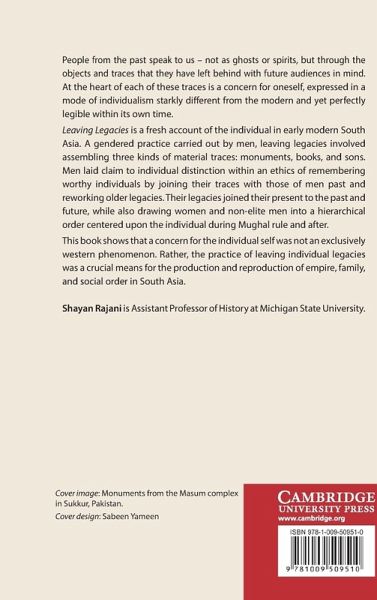 Leaving Legacies is a fresh account of the individual in early modern South Asia. A gendered practice carried out by men, leaving legacies involved assembling three kinds of material traces: monuments, books, and sons. Men laid claim to individual distinction within an ethics of remembering worthy individuals by joining their traces with those of men past and reworking older legacies. Their legacies joined their present to the past and future, while also drawing women and non-elite men into a hierarchical order centered upon the individual during Mughal rule and after. This book shows that a concern for the individual self was not an exclusively western phenomenon. Rather, the practice of leaving individual legacies was a crucial means for the production and reproduction of empire, family, and social order in South Asia.