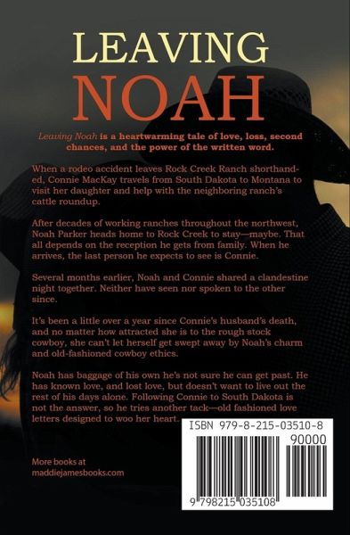 Leaving Noah is a heartwarming tale of love, loss, second chances, and the power of the written word. When a rodeo accident leaves Rock Creek Ranch shorthanded, Connie MacKay travels from South Dakota to Montana to visit her daughter and help with the neighboring ranch's cattle roundup. Raised on a ranch and comfortable in the saddle, she is determined to help. After decades of working ranches throughout the northwest, Noah Parker heads home to Rock Creek to stay-maybe. That all depends on the reception he gets from family. When he arrives, the last person he expects to see there is Connie. Several months earlier at Sarah MacKay's wedding, Noah and Connie shared a clandestine night together. Neither have seen nor spoken to the other since. It's been a little over a year since Connie's husband's death, and no matter how attracted she is to the rough stock cowboy, she can't let herself get swept away by Noah's charm and old-fashioned cowboy ethics. Figuring out the next chapter of her life is her priority-and one she must do alone. Noah has baggage of his own he's not sure he can get past, let alone heap on top of hers. He has known love, and lost love, and doesn't want to live out the rest of his days alone. He loves her, but following Connie to South Dakota is not the answer, so he tries another tack-old fashioned love letters designed to share his story, and perhaps woo her heart.