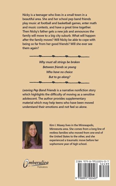 A Creative Non-Fiction Story About a Teen's Fun Times, Traumatic Move and Loyalty to Friendss Nicky is a shy teenager who lives in a small town in a beautiful area. She and her school pep band friends play music at football and basketball games, enter math and music contests, and have a great time together. Then Nicky's father gets a new job and announces her own family will move to a big city suburb. Nicky must face her impending departure, and she feels anxious about leaving her pep band friends. What will happen after the family moves? Will Nicky be able to cope with being so far from her good friends? Will she ever see them again? Leaving Pep Band Friends highlights the difficulty of moving as a sensitive adolescent. Nicky's "Life Before" and "Life After" experiences are compared and contrasted. The themes of family dynamics, peer relationships, and the importance of stability in sorting out identity are explored. Adolescence is a crucial time of social brain development and some teens may be more at risk of serious mood disorders, and even suicidal ideation, if a move interrupts their progress. Supplementary material may help teens who have been moved understand their emotions, adjust to a move, and not feel so alone. "Text Message of Support" is a fictional text message conversation between a teen girl, who is having trouble after being moved, and her grandmother. The messages focus on the main areas underlying the difficulty with change many teens face. Also included is an eight-page "Author's Thoughts on Being Moved as a Teen." Its intent is to normalize and explain why a teen may not adapt well to losing what they know, and have a tough time accepting the new situation. In addition, Appendix A is a list of Crisis Hotlines, Appendix B provides signs of suicidal ideation, and Appendix C provides information about depression includes the additional factor of diabetes distress. Please note the guidance provided is not intended as a substitute for seeking professional assistance.