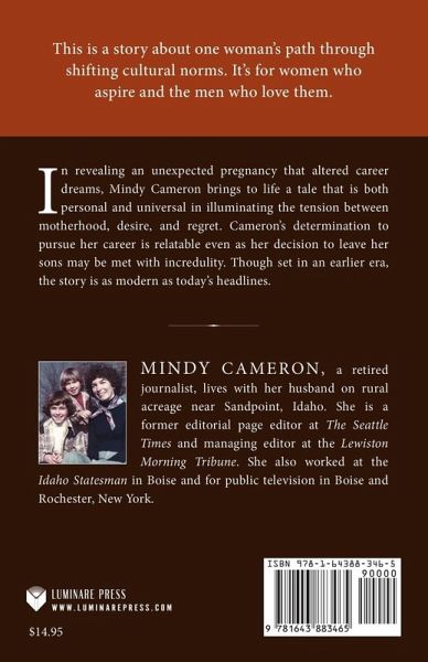 This is a story about one woman's path through shifting cultural norms. It's for women who aspire and the men who love them. In revealing an unexpected pregnancy that altered career dreams, Mindy Cameron brings to life a tale that is both personal and universal in illuminating the tension between motherhood, desire, and regret. Cameron's determination to pursue her career is relatable even as her decision to leave her sons may be met with incredulity. Though set in an earlier era, the story is as modern as today's headlines.