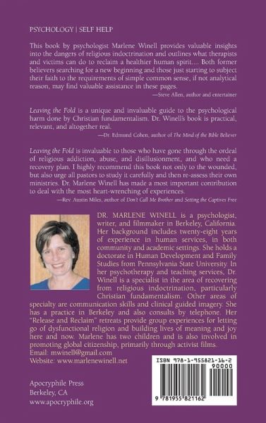 Have you been harmed by toxic religion? Learn how to recover and reclaim your life. Psychologist Marlene Winell is uniquely qualified to address the subject of this book. In addition to her personal experience with leaving fundamentalist religion, she has worked with clients recovering from religion for 28 years. She is known for coining the term Religious Trauma Syndrome. Leaving the Fold is a self-help book that examines the effects of authoritarian religion (fundamentalist Christianity in particular) on individuals who leave the faith. The concrete steps for healing are useful for anyone in recovery from toxic religion. In this book you'll discover: - what you can expect about stages of religious recovery - information about the key issues of recovery - relevant family dynamics - the power of manipulations - motivations for belonging and for leaving religion - specific steps for healing and reclaiming life - further steps for rebuilding life in the present Leaving the Fold is the only self-help psychology book on the subject of religious recovery. The accessible, compassionate writing is ideal for the reader who needs clear information and concrete help. Buy Leaving the Fold and begin your healing journey today!