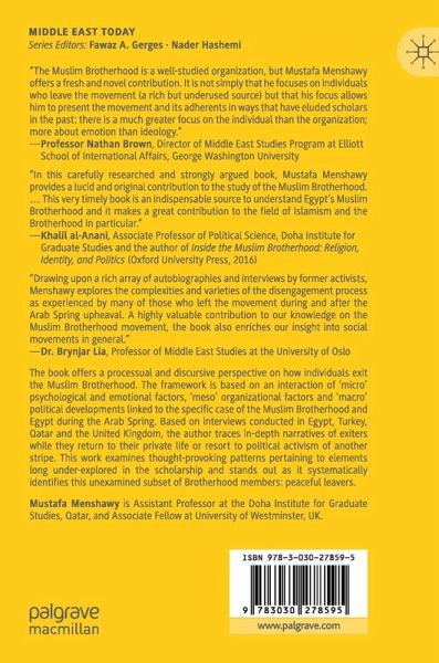 The book offers a processual and discursive perspective on how individuals exit the Muslim Brotherhood. The framework is based on an interaction of 'micro' psychological and emotional factors, 'meso' organizational factors and 'macro' political developments linked to the specific case of the Muslim Brotherhood and Egypt during the Arab Spring. Based on interviews conducted in Egypt, Turkey, Qatar and the United Kingdom, the author traces in-depth narratives of exiters while they return to their private life or resort to political activism of another stripe. This work examines thought-provoking patterns pertaining to elements long under-explored in the scholarship and stands out as it systematically identifies this unexamined subset of Brotherhood members: peaceful leavers.