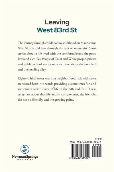 The journey through childhood to adulthood on Manhattan's West Side is told here through the eyes of an essayist. Short stories about a life lived with the comfortable and the poor, Jews and Gentiles, people of color and White people, private and public school stories next to those about the pool hall and the bowling alley. Eighty-Third Street was in a neighborhood rich with color translated here into words providing a sometimes fun and sometimes serious view of life in the '50s and '60's. These essays are about that life and its components, the friendly and the not-so-friendly, and the growing pains.