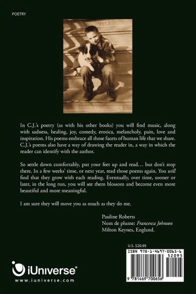 In C.J.'s poetry (as with his other books) you will find music, along with sadness, healing, joy, comedy, erotica, melancholy, pain, love and inspiration. His poems embrace all those facets of human life that we share. C.J.'s poems also have a way of drawing the reader in, a way in which the reader can identify with the author. So settle down comfortably, put your feet up and read... but don't stop there. In a few weeks' time, or next year, read those poems again. You will find that they grow with each reading. Eventually, over time, sooner or later, in the long run, you will see them blossom and become even more beautiful and more meaningful. I am sure they will move you as much as they do me. Pauline Roberts Nom de plume: Francesca Johnson Milton Keynes, England.