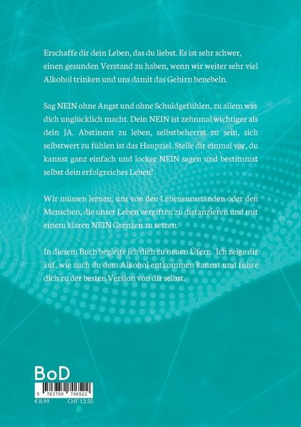 Erschaffe dir dein Leben, das du liebst. Es ist sehr schwer, einen gesunden Verstand zu haben, wenn wir weiter sehr viel Alkohol trinken und uns damit das Gehirn benebelt.Sag NEIN ohne Angst und ohne Schuldgefühlen, zu allem was dich unglücklich macht. Dein NEIN ist zehnmal wichtiger als dein JA. Wir bestimmen selbst, wieweit wir uns manipulieren lassen. Wir lassen uns nicht mehr nur von anderen zu deren Vorteil ausnützen.Abstinent zu leben, selbst beherrscht zu sein, sich selbst wert zu fühlen ist das Hauptziel . Stelle dir einmal vor, du kannst einfach und locker NEIN sagen und bestimmst selbst dein erfolgreiches Leben! Wir müssen lernen, uns von den Lebensumständen oder den Menschen, die unser Leben vergiften zu distanzieren und mit einem klaren NEIN grenzen zu setzen.In diesem Buch begleite ich dich zu neuen Ufern. Ich zeige dir auf, wie auch du dem Alkohol entkommen kannst und führe dich zu der besten Version von dir selbst.