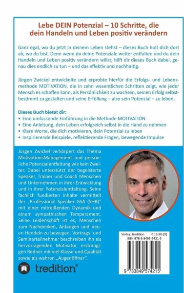 Jürgen Zwickel entwickelte und erprobte hierfür die Erfolg- und Lebensmethode MOTIVATION, die in zehn wesentlichen Schritten zeigt, wie jeder Mensch es schaffen kann, als Persönlichkeit zu wachsen, seinen Erfolg selbstbestimmt zu gestalten und seine Erfüllung - also sein Potenzial - zu leben.