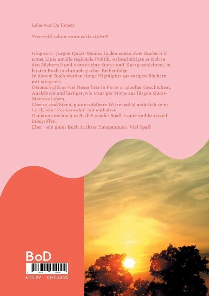 Lebe - was Du liebst!Wer weiß schon wann er/sie stirbt?!Ging es H.-Jürgen Quass-Meurer in den ersten zwei Büchern in erster Linie um die regionale Politik, so beschäftigte er sich in den Büchern 3 und 4 um erlebte Storys und Kurzgeschichten, im letzten Buch in chronologischer Reihenfolge.In diesem Buch wurden einige Highlights aus vorigen Büchern mit integriert.Dennoch gibt es viel Neues hier in Form origineller Geschichten,Anekdoten und lustiger, wie trauriger Storys aus Jürgen Quass-Meurers Leben.Ebenso sind hier a) gute erzählbare Witze und b) natürlich seine Lyrik, wie "Coronawahn" mit enthalten.Dadurch sind auch in Buch 5 wieder Spaß, Ironie und Kurzweil inbegriffen.Eben - ein gutes Buch zu Ihrer Entspannung. Viel Spaß!