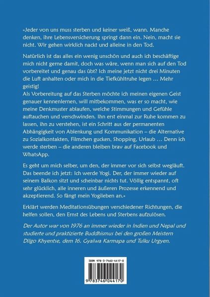 »Jeder von uns muss sterben und keiner weiß, wann. Manche denken, ihre Lebensversicherung springt dann ein. Nein, macht sie nicht. Wir gehen wirklich nackt und alleine in den Tod. Natürlich ist das alles ein wenig unschön und auch ich beschäftige mich nicht gerne damit, doch was wäre, wenn man sich auf den Tod vorbereitet und genau das übt? Ich meine jetzt nicht drei Minuten die Luft anhalten oder mich in die Tiefkühltruhe legen ... Mehr geistig! Als Vorbereitung auf das Sterben möchte ich meinen eigenen Geist genauer kennenlernen, will mitbekommen, was er so macht, wie meine Denkmuster ablaufen, welche Stimmungen und Gefühle auftauchen und verschwinden. Ihn erst einmal zur Ruhe kommen zu lassen, ihn zu verstehen, ist ein Schritt aus der permanenten Abhängigkeit von Ablenkung und Kommunikation - die Alternative zu Sozialkontakten, Filmchen gucken, Shopping, Urlaub ... Denn ich werde sterben - die anderen bleiben brav auf Facebook und WhatsApp. Es geht um mich selber, um den, der immer vor sich selbst wegläuft. Das beende ich jetzt: Ich werde Yogi. Der, der immer wieder auf seinem Balkon sitzt und scheinbar nichts tut. Völlig entspannt, oft sehr glücklich, alle inneren und äußeren Prozesse erkennend und akzeptierend. So fängt mein Yogileben an.« Erklärt werden Meditationsübungen verschiedener Richtungen, die helfen sollen, den Ernst des Lebens und Sterbens aufzulösen. Der Autor war von 1976 an immer wieder in Indien und Nepal und studierte und praktizierte Buddhismus bei den großen Meistern Dilgo Khyentse, dem 16. Gyalwa Karmapa und Tulku Urgyen.