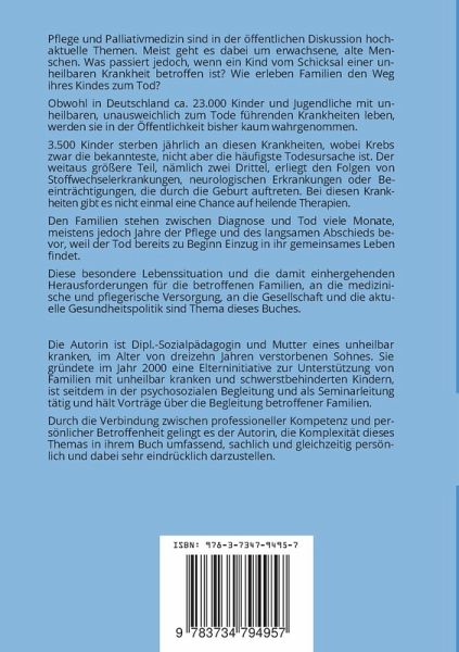 Pflege und Palliativmedizin sind in der öffentlichen Diskussion hochaktuelle Themen. Meist geht es dabei um erwachsene, alte Menschen. Was passiert jedoch, wenn ein Kind vom Schicksal einer unheilbaren Krankheit betroffen ist? Wie erleben Familien den Weg ihres Kindes zum Tod? Obwohl in Deutschland ca. 23.000 Kinder und Jugendliche mit unheilbaren, unausweichlich zum Tode führenden Krankheiten leben, werden sie in der Öffentlichkeit bisher kaum wahrgenommen.3.500 Kinder sterben jährlich an diesen Krankheiten, wobei Krebs zwar die bekannteste, nicht aber die häufigste Todesursache ist. Der weitaus größere Teil, nämlich zwei Drittel, erliegt den Folgen von Stoffwechselerkrankungen, neurologischen Erkrankungen oder Beeinträchtigungen, die durch die Geburt auftreten. Bei diesen Krankheiten gibt es nicht einmal eine Chance auf heilende Therapien. Den Familien stehen zwischen Diagnose und Tod viele Monate, meistens jedoch Jahre der Pflege und des langsamen Abschieds bevor, weil der Todbereits zu Beginn Einzug in ihr gemeinsames Leben findet. Diese besondere Lebenssituation und die damit einhergehenden Herausforderungen für die betroffenen Familien, an die medizinische und pflegerische Versorgung, an die Gesellschaft und die aktuelle Gesundheitspolitik sind Thema dieses Buches.