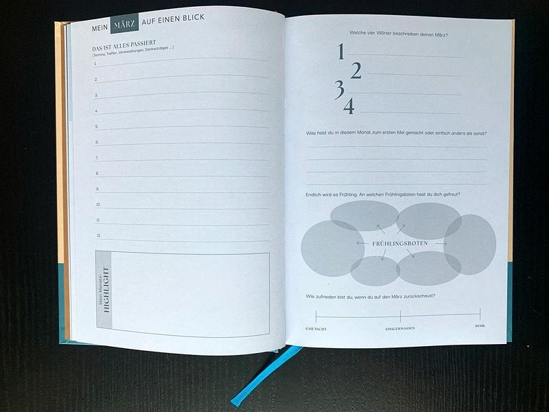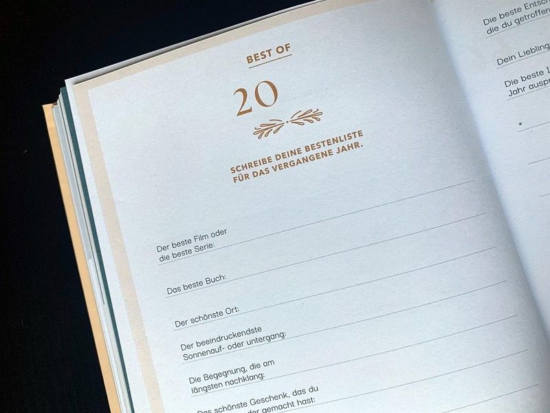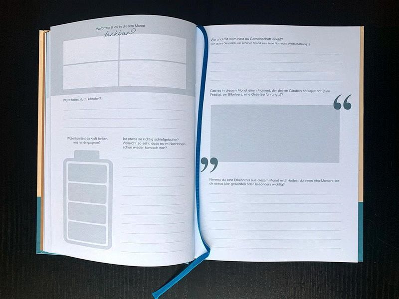 Das Jahres-Journal ist aufgeteilt in zwei Abschnitte. Zunächst gibt es Monatsreflexionen. Dabei hat jeder Monat vier Seiten zum Ausfüllen. Neben den Monatshighlights warten verschiedene Fragen zu Herausforderungen, Begegnungen, Glaubensleben, Erkenntnissen und vielem mehr. Dazu kommt eine karierte Doppelseite, die individuell gefüllt werden darf mit eigenen Gedanken oder eingeklebten Erinnerungen.
