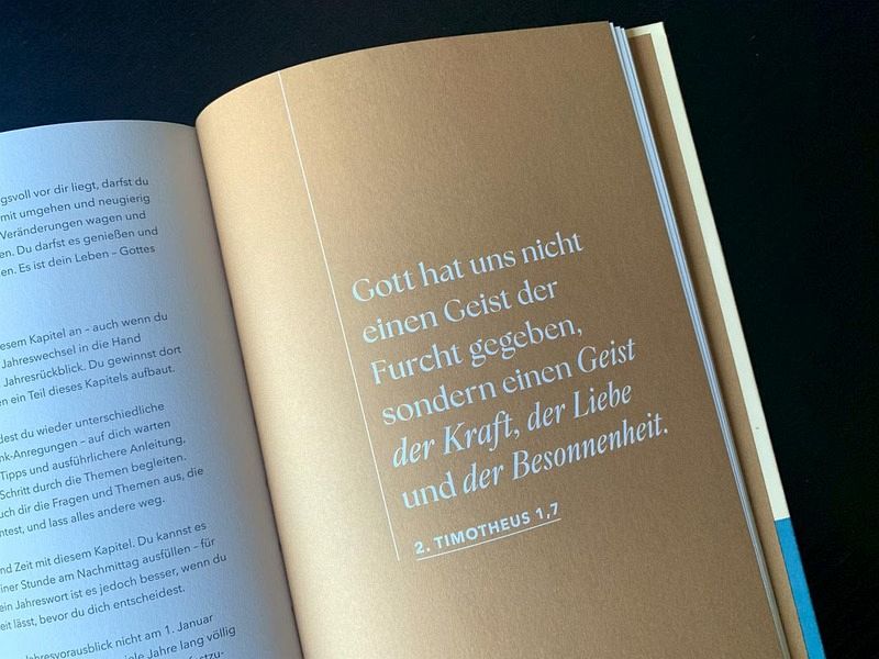 Der zweite Abschnitt ist der Jahresrückblick und -vorausblick. Dieser kann aber auch vor den Monatsrückblicken am Jahreswechsel ausgefüllt werden. Der Jahresrückblick taucht dabei zusätzlich zum allgemeinen Rückblick nochmal tiefer ein in die verschiedenen Lebensbereiche Gesundheit, Beziehungen, Glaube&Gott, Beruf&Berufung, Freizeit&Hobbys und Pläne/Erfolge/Misserfolge. So lässt sich eine allgemeine Bestandsaufnahme machen und auch einiges im alten Jahr liegen lassen. Der Vorausblick ist kürzer gehalten und gleichzeitig mit viel informativem Text, der inspiriert und anleitet, ein Jahreswort zu definieren, und motiviert, die eigenen Ziele umzusetzen.