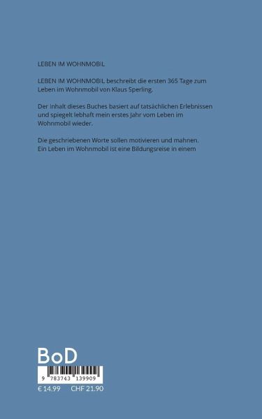 LEBEN IM WOHNMOBIL LEBEN IM WOHNMOBIL beschreibt die ersten 365 Tage zum Leben im Wohnmobil von Klaus Sperling.Der Inhalt dieses Buches basiert auf tatsächlichen Erlebnissen und spiegelt lebhaft das erste Jahr vom Leben im Wohnmobil wieder.Die Reise führt durch viele Länder Europas und beschäftigt sich mit den ersten Grundgedanken zum Leben im Wohnmobil und der notwendigen Ausführung um hier die Tatsachen berichten zu können. Die geschriebenen Worte sollen motivieren und mahnen. Ein Leben im Wohnmobil ist eine Bildungsreise in einem Lebensabschnitt. Dieses Buch ist kein Ratgeber und keine Vorlage für Jedermann um das Leben im Wohnmobil zu verwirklichen. Jeder der den Band 1 liest wird die Fortsetzung in zwölf Monaten ebenfalls lesen wollen. Davon bin ich überzeugt.LEBEN IM WOHNMOBIL GRUNDLOS GLÜCKLICH