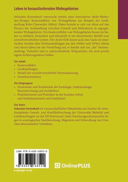 Sebastian Kurtenbach untersucht mittels eines innovativen Mehr-Methoden-Designs Kontexteffekte von Wohngebieten am Beispiel der Großsiedlung Köln-Chorweiler (Mitte). Dabei bezieht er sich vor allem auf den Prozess der Aushandlung zwischen Umwelt und Individuum in segregierenden Wohngebieten. Um Kontexteffekte von Wohngebieten besser als bisher zu erklären, formuliert und überprüft er ein theoretisches Modell zum umweltvermittelten Lernen. Der Autor füllt damit auch eine Lücke in empirischen Studien über Neubausiedlungen aus den 1960er und 1970er Jahren und räumt dabei mit der Vorstellung auf, es handle sich um "die" Neubausiedlung. Vielmehr sind es unterschiedliche Teilquartiere, die auch jeweils eigene Erfahrungsräume bilden.