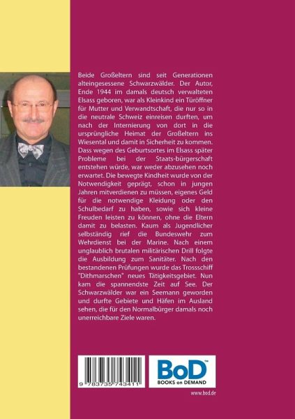 Die Biografie über ein spannendes Leben ist nicht nur zeitgeschichtlich interessant. Es führt auch in eine Epoche, die noch nicht allzu fern zurückliegt, sich aber noch in einer völlig anderen Welt zutrug. Beide Großeltern waren alteingesessene Schwarzwälder. Der Autor, Ende 1944 im damals deutsch verwalteten Elsass geboren, war als Kleinkind ein Türöffner für Mutter und Verwandtschaft, die nur dank ihm in die neutrale Schweiz einreisen durften, um nach der Internierung von dort in die ursprüngliche Heimat der Großeltern ins Kleine Wiesental und damit in Sicherheit zu kommen. Dass wegen des Geburtsortes im Elsass später Probleme bei der Staatsbürgerschaft entstehen würde, war weder abzusehen noch erwartet. Die bewegte Kindheit wurde von der Notwendigkeit geprägt, schon als Kind beizutragen, etwas zu verdienen, um Kleidung oder den Schulbedarf kaufen und sich kleine Freuden leisten zu können, ohne die Eltern damit zu belasten. Kaum als Jugendlicher selbständig, rief die Bundeswehr zum Wehrdienst bei der Marine. Nach einem unglaublich brutalen militärischen Drill folgte die Ausbildung zum Sanitäter. Nach den bestandenen Prüfungen wurde das Trossschiff Dithmarschen das Tätigkeitsgebiet. Nun kam die spannendste Zeit auf See. Der Schwarzwälder war Seemann und durfte Gebiete und Häfen im Ausland sehen, die für den Normalbürger damals noch unerreichbare Ziele waren.