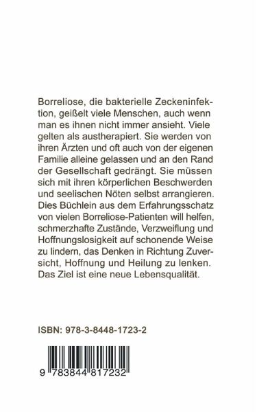 Leben mit BorrelioseBorreliose, die durch Zecken übertragene bakterielle Infektion, hinterlässt bei vielen Patientinnen und Patienten trotz Therapie vielfältige Beschwerdebilder, gegen die Ärzte, Heilpraktiker und Heiler häufig machtlos sind. Der Patient muss selbst aktiv werden, um sich aus dem zähen Sog von Schmerzen, Trauer, Verzweiflung und Mutlosigkeit zu befreien, um wieder heilende Hoffnung und Zuversicht zu schöpfen. Dieses Buch schöpft aus dem Autoren-Wissen von über zehn Jahren Recherche bei Patienten und Ärzten für Bücher und Zeitschriften. Es enthält eine Fülle an Maßnahmen, persönlichen Strategien und physikalischen Anwendungen vom Erfahrungsschatz der Borreliose-Selbsthilfegruppen aus 20 Jahren.Zusätzlich führen drei große Kapitel ein in die Kunst der Selbstheilung durch Innere Bilder, durch Bewusstseinsreisen und die Macht des Bewusstseins als heilendes Element.