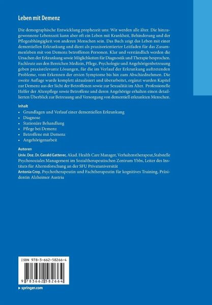 Die demographische Entwicklung prophezeit uns: Wir werden alle älter. Die hinzugewonnene Lebenszeit kann aber oft ein Leben mit Krankheit, Behinderung und der Pflegeabhängigkeit von anderen Menschen sein. Das Buch zeigt das Leben mit einer dementiellen Erkrankung und dient als praxisorientierter Leitfaden für das Zusammenleben mit von Demenz betroffenen Personen. Klar und verständlich werden die Ursachen der Erkrankung sowie Möglichkeiten für Diagnostik und Therapie besprochen. Fachleute aus den Bereichen Medizin, Pflege, Psychologie und Angehörigenbetreuung geben praxisrelevante Lösungen, für die im Verlauf der Erkrankung auftretenden Probleme, vom Erkennen der ersten Symptome bis hin zum Abschiednehmen. Die zweite Auflage wurde komplett aktualisiert und überarbeitet, ergänzt wurden Kapitel zur Demenz aus der Sicht der Betroffenen sowie zur Sexualität im Alter. Professionelle Helfer der Altenpflege sowie Betroffene und deren Angehörige erhalten einen detaillierten Überblickzur Betreuung und Versorgung von dementiell erkrankten Menschen.