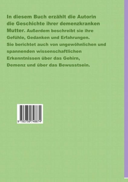 Eine berührende Reise durch Erinnerungen, Emotionen und neueste Erkenntnisse zum Altern. Wie lebt es sich mit einer Mutter, die zunehmend in ihrer eigenen Welt verschwindet? Was bedeutet es, täglich Abschied zu nehmen, ohne endgültig loslassen zu können? Die Autorin nimmt uns mit auf eine intensive Reise durch emotionale Tiefen, stille Momente der Nähe und wissenschaftlich fundierte Einsichten. Offen schildert sie die Jahre an der Seite ihrer demenzkranken Mutter - mit allen Herausforderungen, Verlusten und leisen Hoffnungen. Neben den persönlichen Erlebnissen beleuchtet sie neue Forschungsergebnisse zum Bewusstsein, zur Gehirnalterung und zu Möglichkeiten, geistige Gesundheit bis ins hohe Alter zu fördern. Dabei gelingt ihr die seltene Balance zwischen biografischer Intimität und fachlicher Klarheit - ein Buch, das aufrüttelt, informiert und tröstet. Ideal für pflegende Angehörige, an Demenz interessierte Leserinnen und Leser sowie Menschen, die sich mit dem Thema Altern, Gehirn und familiäre Fürsorge auseinandersetzen wollen.