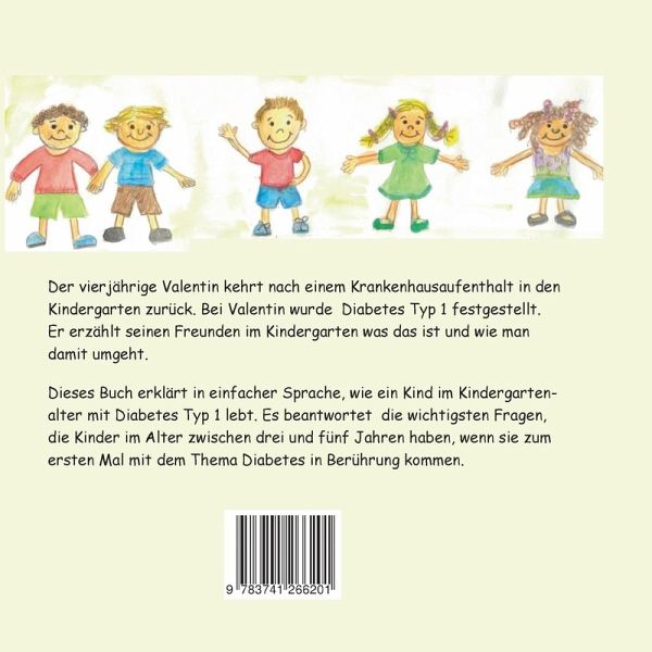 Der vierjährige Valentin kehrt nach einem Krankenhausaufenthalt in den Kindergarten zurück. Bei Valentin wurde Diabetes Typ 1 festgestellt. Er erzählt seinen Freunden im Kindergarten was das ist und wie man damit umgeht.Dieses Buch vermittelt in einfacher Sprache das grundlegende Wissen über Diabetes Typ 1. Es beantwortet die wichtigsten Fragen, die Kinder im Alter zwischen drei und fünf Jahren haben, wenn sie zum ersten Mal mit dem Thema Diabetes in Berührung kommen. Die Autorin verzichtet dazu, soweit möglich, auf medizinische Fachbegriffe. Das Buch richtet sich vor allem an Kinder im Kindergarten- und Vorschulalter sowie deren Eltern und Betreuungspersonen. Es eignet sich aber auch als erster Einstieg in die Welt des Diabetes Typ 1 für ältere Kinder, um das Wissen später mit altersgerechter und ausführlicherer Literatur zu vertiefen.