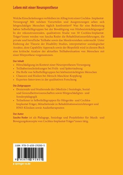 Welche Einschränkungen verbleiben im Alltag trotz einer Cochlea-Implantat-Versorgung? Mit welchen Vorurteilen und Ausgrenzungen sehen sich hörgeschädigte Menschen täglich konfrontiert? Was für eine Bedeutung haben Selbsthilfegruppen bei der Bewältigung von Hörbeeinträchtigungen? In der rekonstruierenden, qualitativen Studie von 50 Cochlea-Implantat-Träger_innen werden von Sascha Roder die Rehabilitationserfahrungen, die private und berufliche Teilhabe sowie das Musikverstehen untersucht. Unter Einbezug der Theorie der Disability Studies, interpretativer soziologischer Ansätze, dem Capability Approach sowie der Biopolitik wird in diesem Buch eine kritische Analyse der aktuellen Teilhabesituation von Menschen mit einer Hörprothese vorgenommen.
