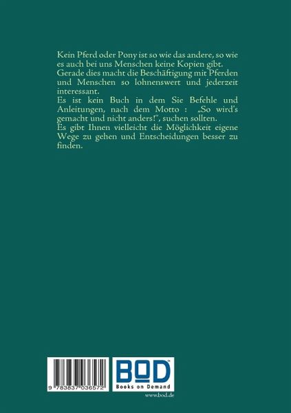 Kein Pferd oder Pony ist so wie das andere, so wie es auch bei uns Menschen keine Kopien gibt.Gerade dies macht die Beschäftigung mit Pferden und Menschen so lohnenswert und jederzeit interessant.Die Geschichte, die hier beschrieben ist, entspricht den tatsächlichen Gegebenheiten.Es ist kein Buch in dem Sie Befehle und Anleitungen, nach dem Motto : ?So wird?s gemacht und nicht anders!?, suchen sollten.Es gibt Ihnen vielleicht die Möglichkeit eigene Wege zu gehen und Entscheidungen besser zu finden.