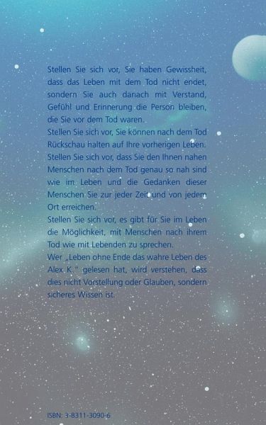 Stellen Sie sich vor, Sie haben Gewissheit, dass das Leben mit dem Tod nicht endet, sondern Sie auch danach mit Verstand, Gefühl und Erinnerung die Person bleiben, die Sie vor dem Tod waren. Stellen Sie sich vor, Sie können nach dem Tod Rückschau halten auf Ihre vorherigen Leben. Stellen Sie sich vor, dass Sie den Ihnen nahen Menschen nach dem Tod genau so nah sind wie im Leben und die Gedanken dieser Menschen Sie zu jeder Zeit und von jedem Ort erreichen. Stellen Sie sich vor, es gibt für Sie im Leben die Möglichkeit, mit Menschen nach ihrem Tod wie mit Lebenden zu sprechen. Wer ¿Leben ohne Ende ¿ das wahre Leben des Alex K.¿ gelesen hat, wird verstehen, dass dies nicht Vorstellung oder Glauben, sondern sicheres Wissen ist.